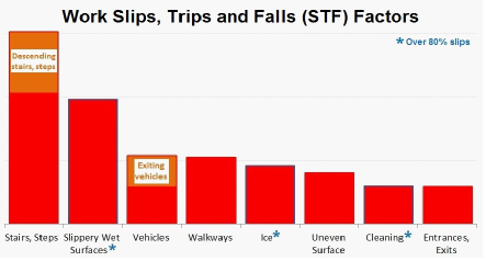 Slips, trips and falls are the second highest single cause of workplace injuries - there were about 1,700 workplace slips, trips and falls reported to the HSA in 2017 Slips, trips and falls are more likely to lead to significant time off work compared to all other accidents. Females account for a significant percentage of slips, trips and falls victims