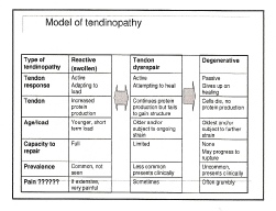 This model of tendonopathy proposes a progressive deterioration from reactive tendon on initial injury through to tendon dysrepair to degenerative tendon.