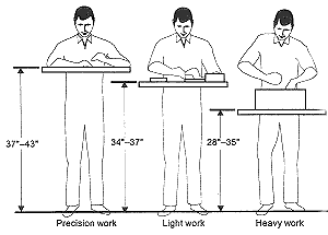 Key factors to be considered will include what the hands need to do, where the feet need to be placed,, what surface is being stood on and how stable it is, the head position and eye level / sight lines. The task itself will also determine the correct height at which the workstation is set as precision work requires greater support for the upper limbs while heavy work needs the body weight to be brought to bear during the execution of the task. The following give some indication of what is needed.